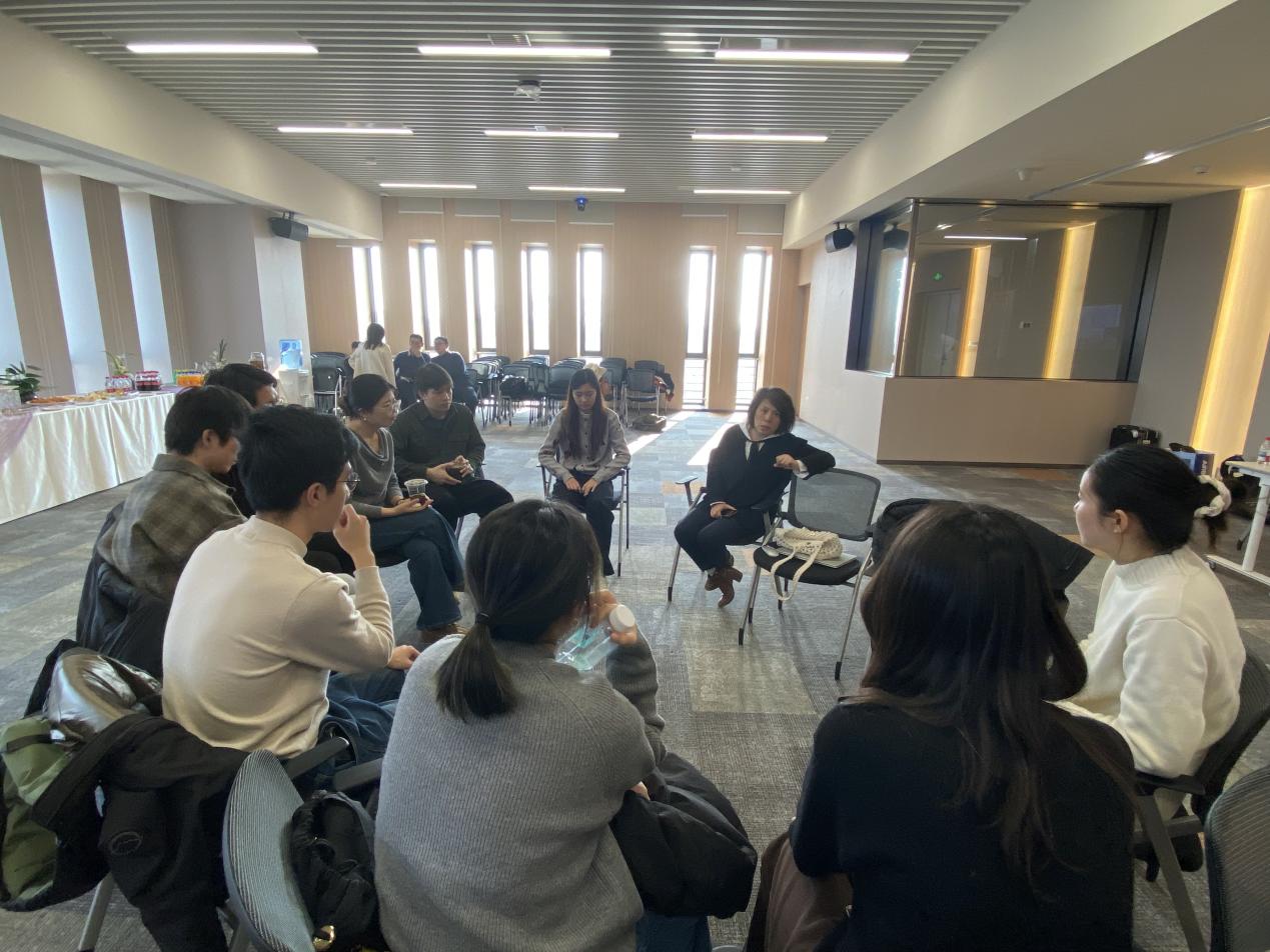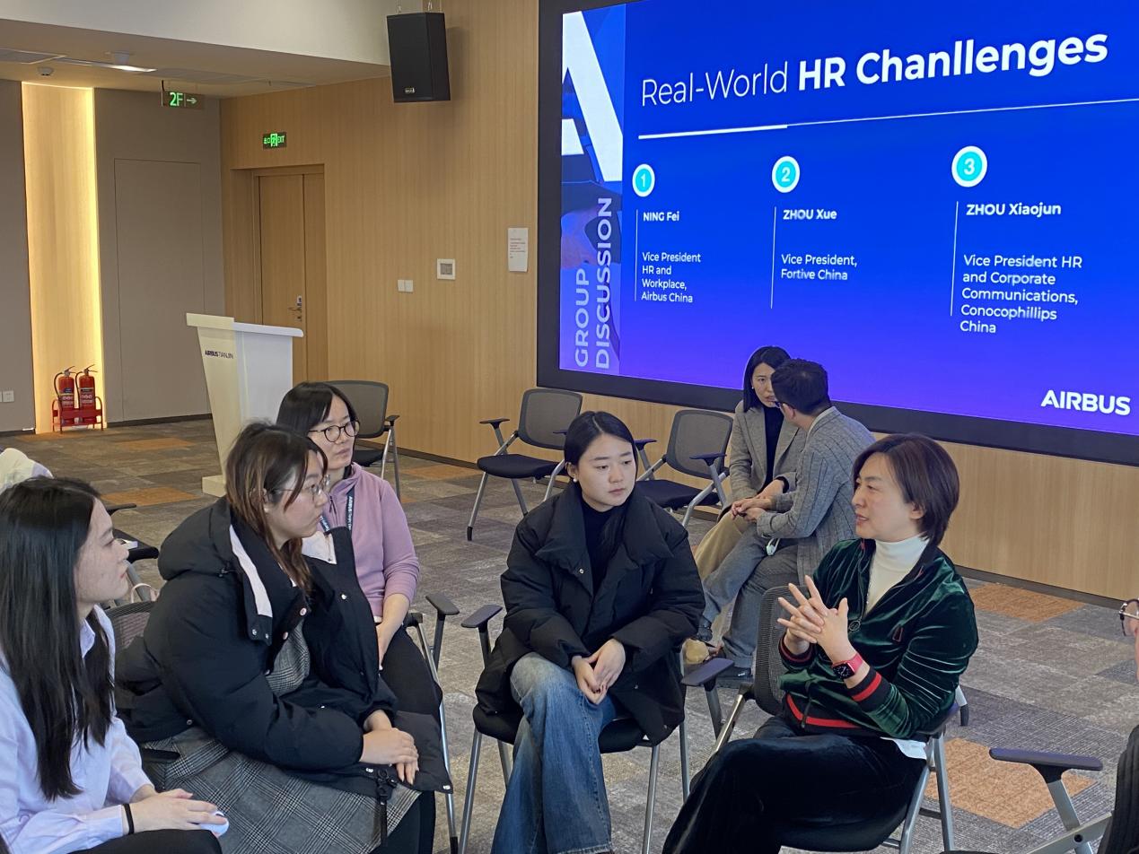 在互动小组研讨环节,同学们分为三个小组,分别由三位企业人力资源负责人带领,围绕“当前人力资源实践中的挑战与应对”展开深入讨论。子议题覆盖远程办公政策设计、员工留存策略、人工智能在招聘中的应用、职场心理健康支持等现实问题,并特别结合航空等高端制造行业的实际情况进行探讨。