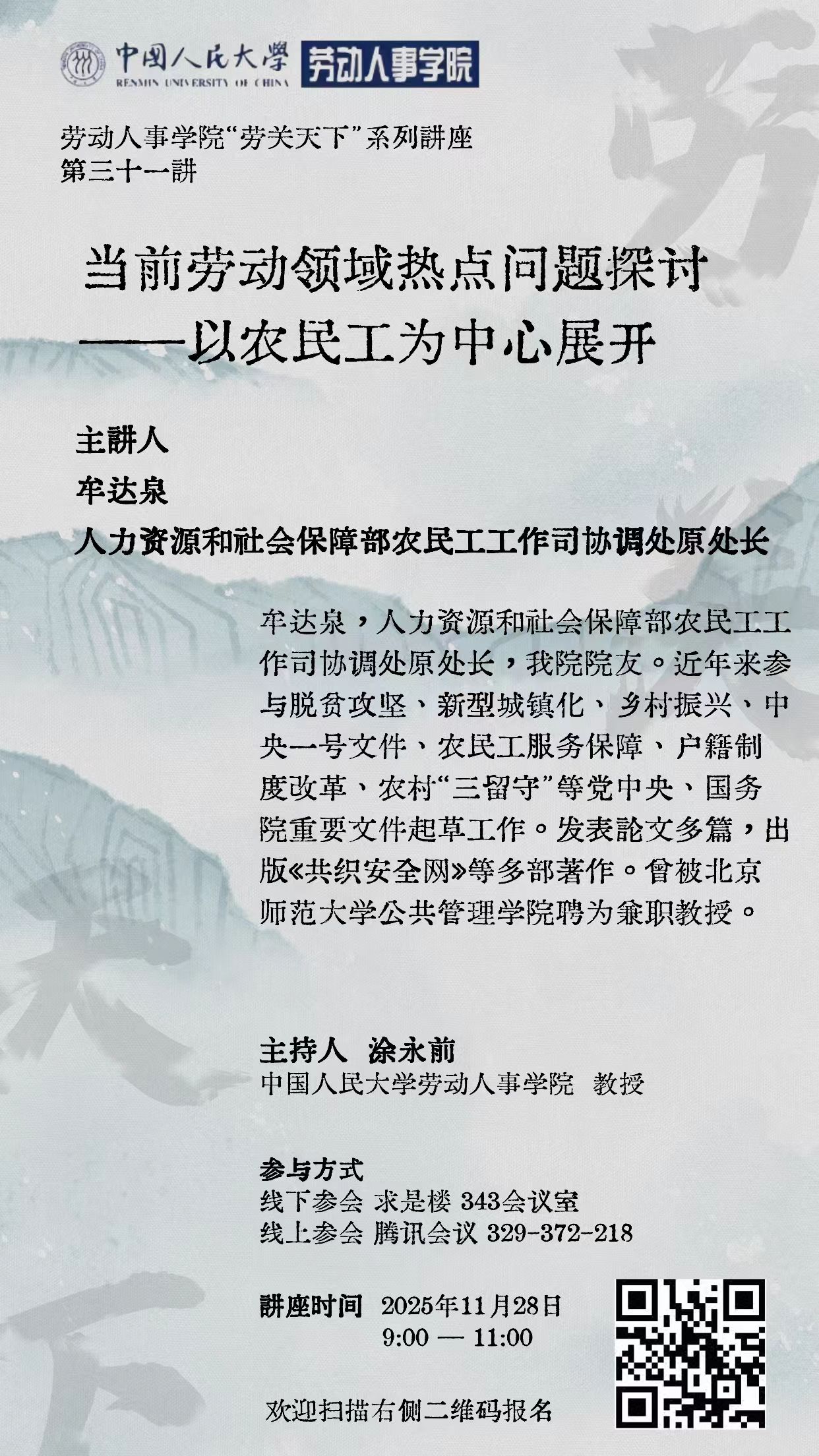 本次讲座围绕我国当前劳动领域的关键热点,以农民工群体为中心展开系统讨论。讲座将从宏观政策、制度变迁到个体处境多个层面,分析农民工面临的就业质量改善、社会保障覆盖、城市融入、权益保护、新就业形态转变等核心议题。