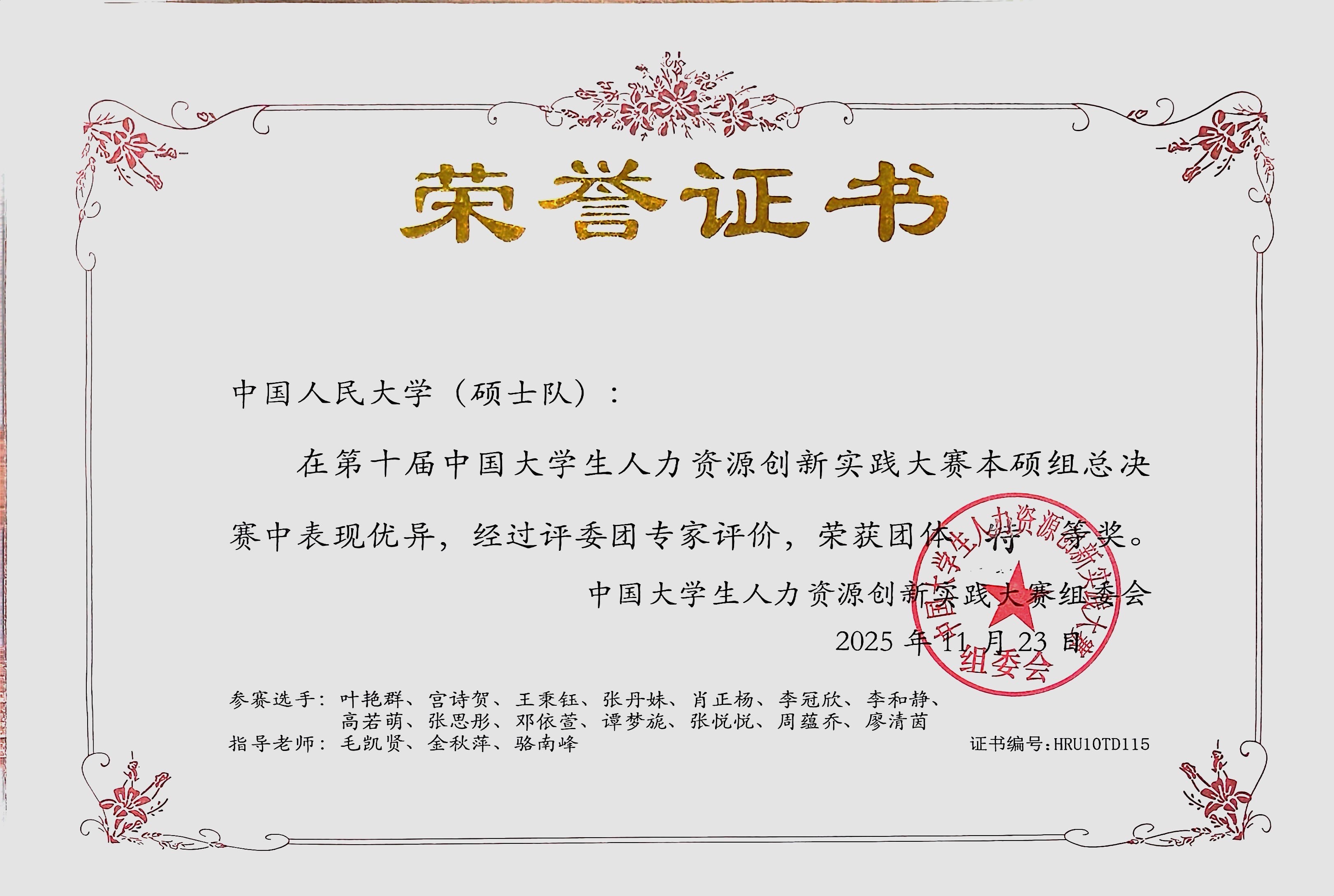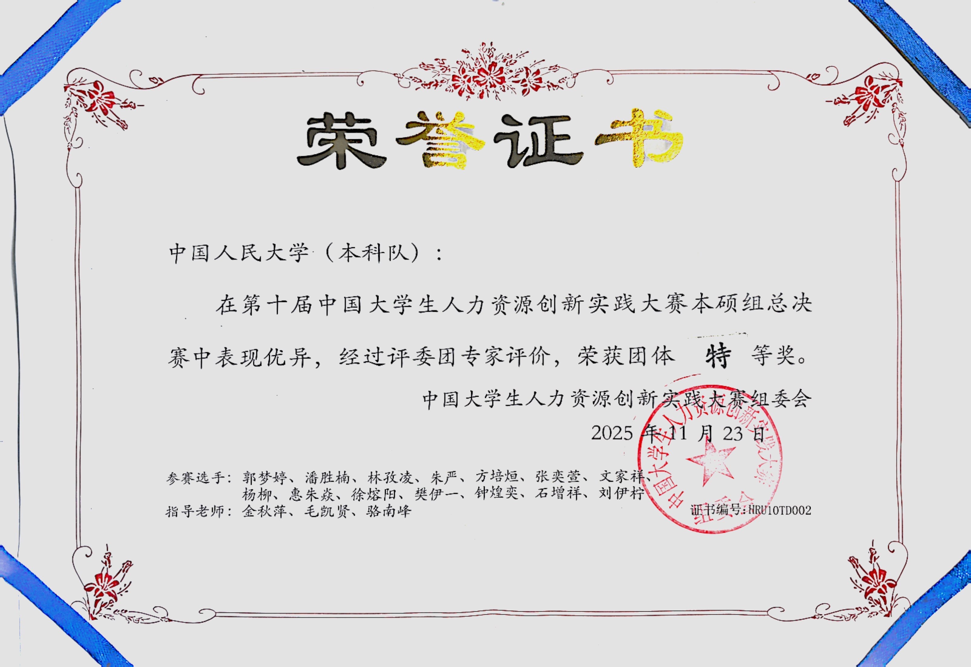 在为期两天的全国总决赛中,我院28名选手协作并进,奋斗在八个赛道。她们在创新的“HR+AI”赛道中展现出对前沿技术的深刻理解,在全新的“企业工会与民主管理”赛道里体现了对劳动关系的娴熟把握,在“HR+出海”赛道中用流利的英语沟通彰显了国际视野,在其他各经典赛道中同样以扎实的专业功底和卓越的团队协作能力展现出劳人学子的专业风采。经过激烈角逐,我院学子在各个赛道均表现优异,在AI赛道、实务设计、案例分析、无领导小组讨论等多个赛道中,本硕队伍选手均斩获个人特等奖,她们的出色表现,赢得了评委及各高校师生的广泛认可,最终不负众望,载誉而归。