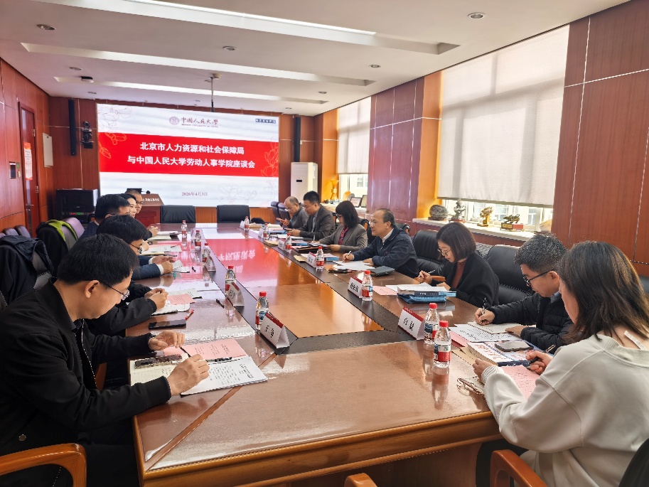 2026年4月3日上午,中国人民大学劳动人事学院与北京市人力资源和社会保障局在中关村校区求是楼347会议室举行座谈会。北京市人力资源和社会保障局研究室主任、科学研究所所长(兼)韩玉川,研究室副主任朱子砚、赵金望,科学研究所副所长赵文婧,以及科学研究所干部王争来访。中国人民大学劳动人事学院院长赵忠教授,中国人民大学人事处副处长李育辉教授,劳动人事学院劳动经济系主任赵丽秋教授,中国人民大学招生就业处副处长(挂职)、劳动人事学院劳动关系系主任张皓副教授,劳动人事学院社会保障系主任白晨副教授,以及劳动人事学院国内合作事务项目主任李乐乐副教授参加座谈会,赵忠院长主持本次会议。