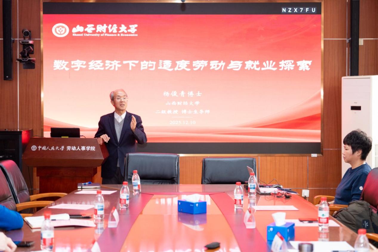 山西财经大学山西省中小企业发展研究院院长杨俊青教授谈到中国就业的过去与未来将是从工业经济到数字经济、从劳动力无限供给到劳动力有限与稀缺、从数量到质量、从工资保障到工资激励的转变;接着分享了他对数字经济下的适度劳动与就业的探索,他指出,数字经济带来劳动时空动态化、工作生活边界模糊化、岗位任务化等新特征。在此背景下,应推动管理方式向“数字人本管理”转型,构建适应“人机协作”的人力资源管理体系,以实现更可持续的就业发展。他并深情回顾了跟随曾湘泉教授参与学术活动的经历。