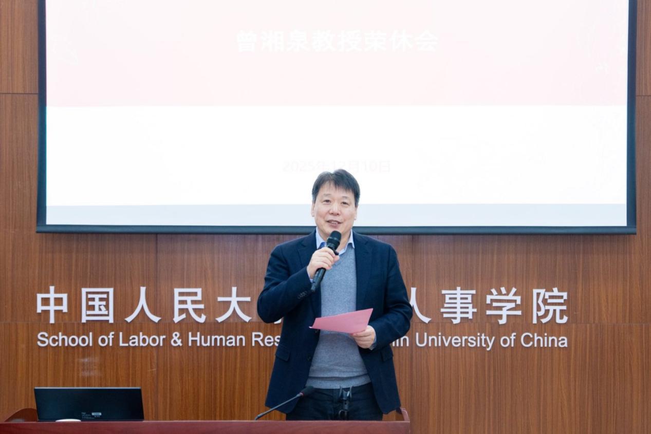 2025年12月10日,中国就业的理论与实践研讨会暨曾湘泉教授荣休会在中国人民大学劳动人事学院举行。华南师范大学王春超教授,中央党校(国家行政学院)社会和生态文明教研部赖德胜教授,山西财经大学山西省中小企业发展研究院院长杨俊青教授,首都经济贸易大学劳动经济学院院长罗楚亮教授,中国劳动关系学院经济管理学院院长纪韶教授,中国人民大学经济学院宋扬教授,中国人民大学劳动人事学院曾湘泉教授等来自校内外的专家学者及学院师生参会,劳动人事学院院长赵忠教授主持会议。