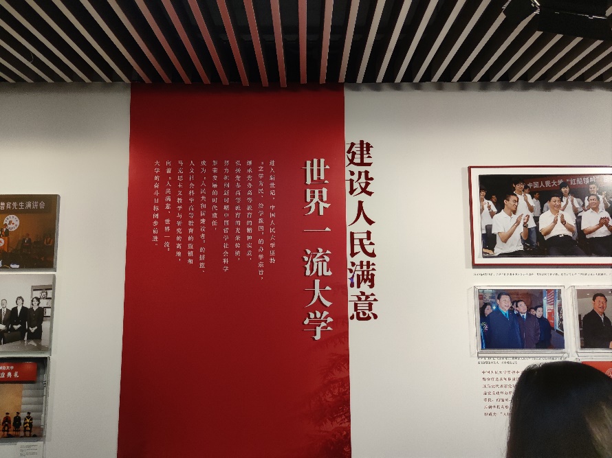 随后,讲解员向支部成员介绍了中国人民大学校徽及其内涵,三个篆体的“人”字分别代表人民、人本和人文,寓意中国人民大学是人民的大学,坚持以人为本的精神,以及在人文社会科学领域独树一帜。继续前行,走廊一边出现了历届党和国家领导人视察人民大学的珍贵影像,展现出中国人民大学在我国高等教育领域的重要地位。