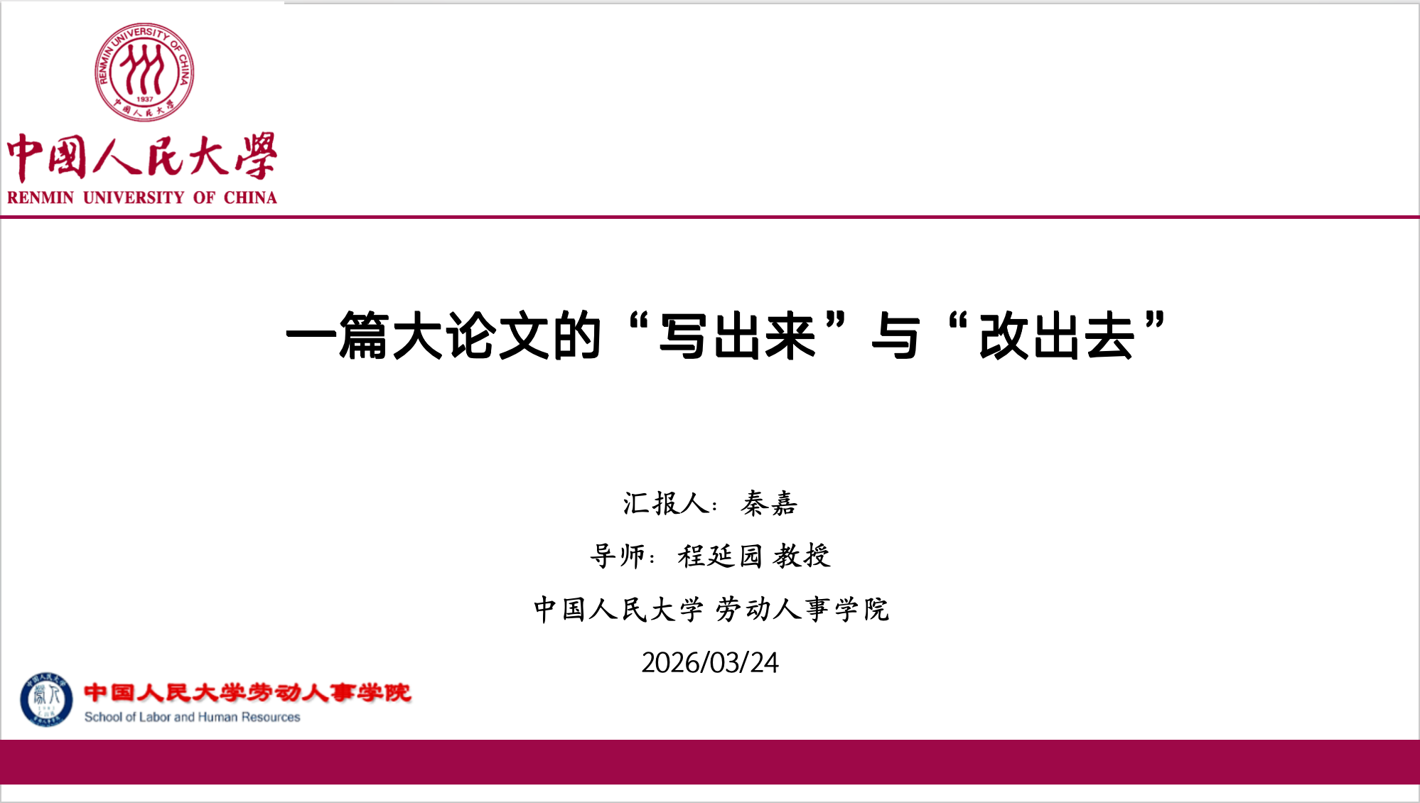 2026年3月24日上午十点,劳动人事学院蓬“博”向上系列活动第七期如期举行。本次活动特别邀请到新晋人力资源管理博士秦嘉,以“一篇大论文的‘写出来’与‘改出去’”为主题,结合自身论文撰写实践经验,细致拆解博士学位论文从研究设计到终稿完成的全流程关键要点,带来了一场干货满满的分享会。此次分享会由骆南峰教授主持,四十余位博士生通过线上的方式积极参与,热烈讨论,取得了良好的交流效果。