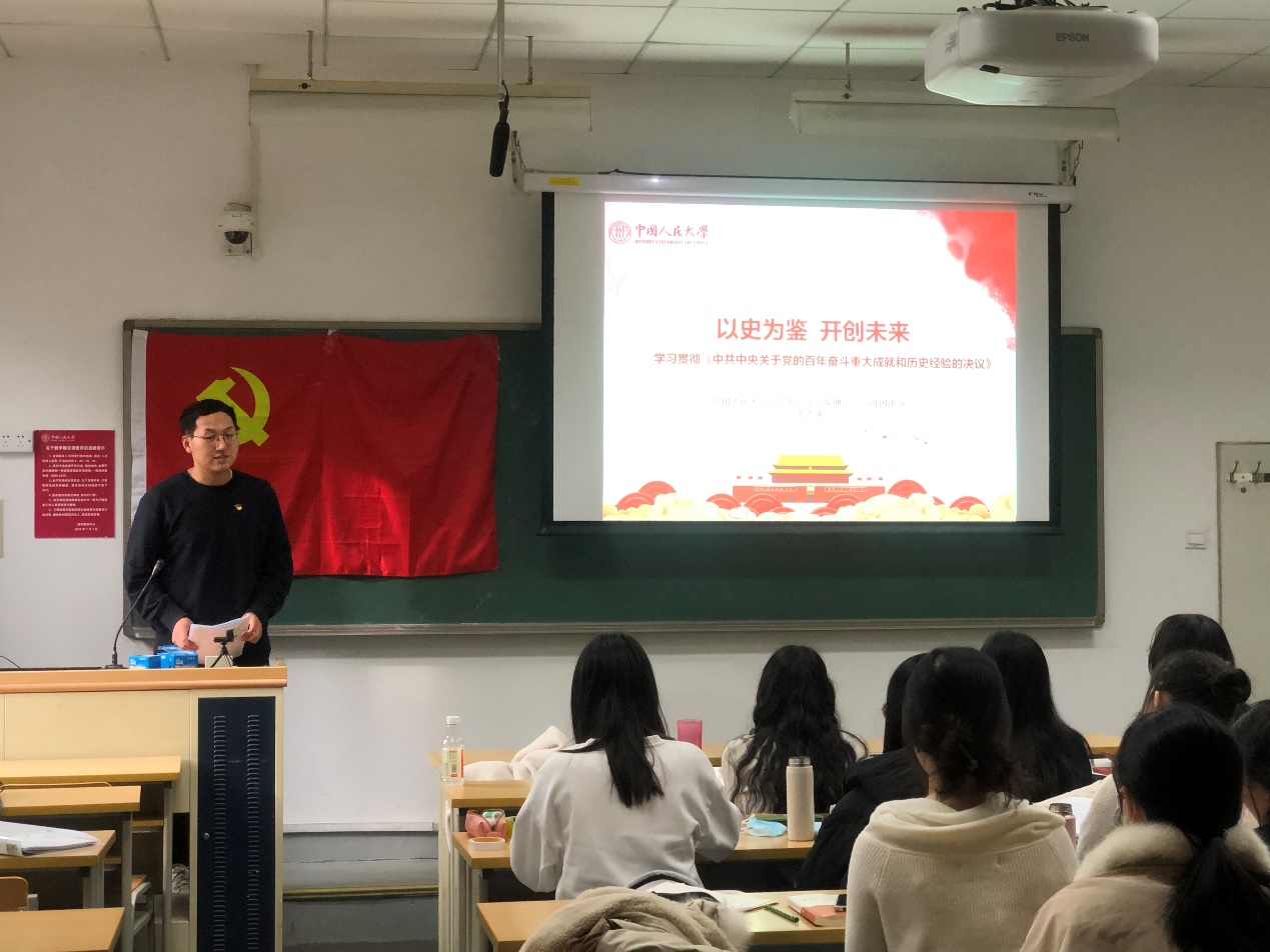 12月8日,劳动人事学院2021级硕士劳动经济学班党支部在公教二楼2413教室召开了以“学习十九届六中全会精神,聚焦第三个历史决议”为主题的党日活动。本次会议邀请马克思主义学院博士生宣讲团的讲师张志强进行讲解。支部全体党员、积极分子参加了本次学习,来自学院其他支部和学生党建促进会的党员同志前来交流调研。本次活动由支部书记马迪主持。