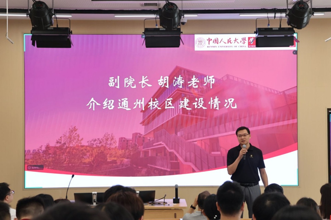 副院长胡涛从三个方面对通州校区的建设情况进行了全方位的介绍,着重强调通州校区的落地具有建设北京城市副中心和疏解非首都职能的重大战略意义。他从东南西北四个方位详细介绍了通州校区的区位优势,带领新生同学了解了新校园周边的商业区、政府机构与文化地标。最后,胡涛指出新校区在住宿、运动、就餐、上课等方面的配套设施完善,为大家提供了良好的学习和研究环境。