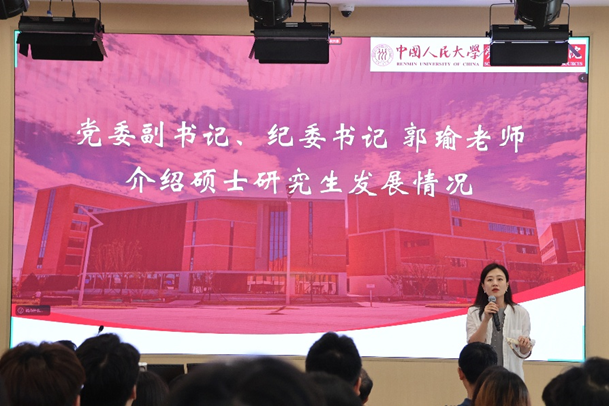 学院党委副书记、纪委书记郭瑜为硕士新生解读了硕士研究生阶段的发展图景。她首先向同学们送上诚挚祝福——作为通州校区的首批“开拓者”,大家将与这片新园共成长,希望大家在这份凝聚着期待与匠心的崭新天地里,既要惜时如金深耕学业,更要涵养身心向阳而行。随后她系统梳理了往届毕业生的发展轨迹:从稳居高位的就业率到多元广阔的就业平台,立体呈现了学院“高质量引领、多元化发展”的人才培养特色。她叮嘱同学们既要深耕学术沃土,在专业研究中勇攀高峰;也要早做职业规划,在学习与就业的动态平衡中稳步前行,让青春在奋斗中绽放光彩。