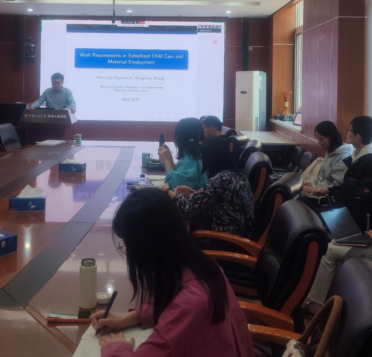 2026年4月20日下午,由劳动人事学院主办,劳动经济系和中国就业研究所承办的“劳动经济学双周论坛”第229期讲座在求是楼347会议室成功举办。来自浙江大学的张宏亮副教授分享了主题为“Work Requirements in Subsidized Child Care and Maternal Labor Supply”的研究。本次论坛由劳动人事学院赵丽秋教授主持,劳动人事学院王非副教授、翁茜副教授、邹先强副教授、林琳讲师、王雪凝讲师、陈泽阳讲师以及其他校内外师生参与了此次讲座。