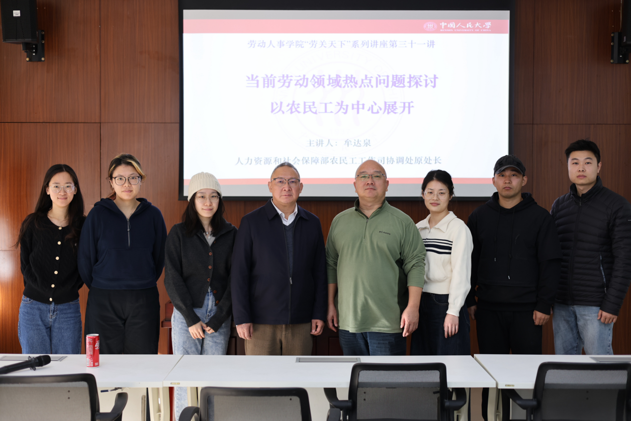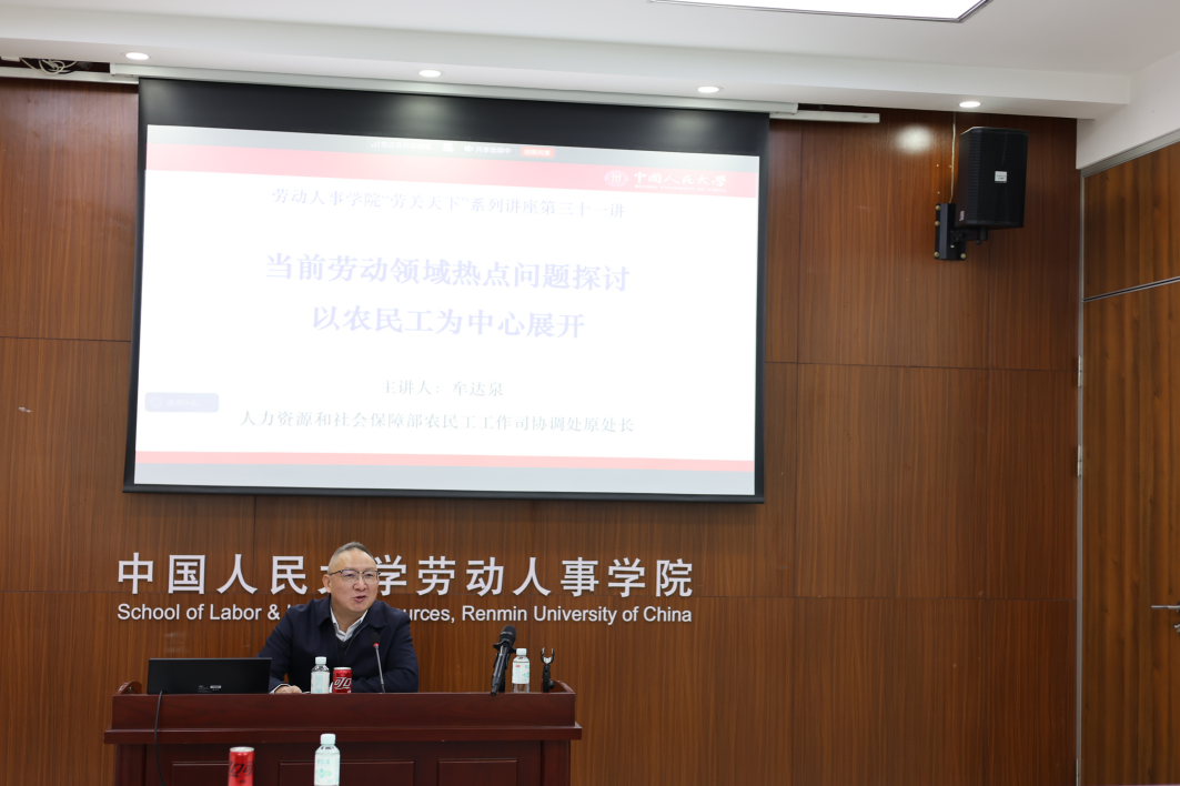 2025 年 11 月 28 日上午,由中国人民大学劳动人事学院主办,劳动关系系承办的“劳关天下”系列讲座第三十一讲在中国人民大学求是楼成功举办。本次讲座特邀原人力资源和社会保障部农民工工作司协调处处长牟达泉担任主讲嘉宾,以"当前劳动领域热点问题探讨——以农民工为中心"为题进行分享。讲座由劳动人事学院涂永前教授主持,线上线下共计50余名师生共同参与。