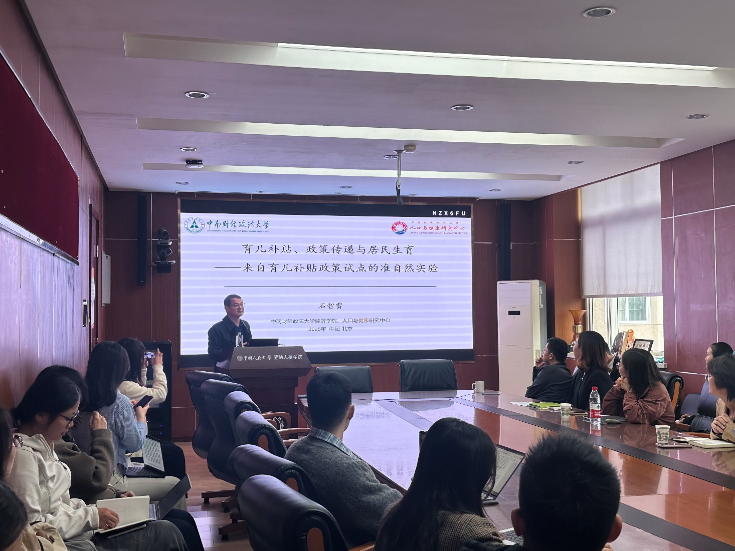 劳动人事学院社会保障半月谈第90期于2025年10月10日(星期五)下午14:00至15:30在求是楼347教室成功举行。中南财经政法大学经济学院石智雷教授进行了题为“育儿补贴、政策传递与居民生育——来自育儿补贴政策试点的准自然实验”的分享。本次学术讲座由劳动人事学院社会保障系刘宏教授主持,郭瑜教授、赵丽秋教授、张琼教授、王天宇副教授、邹先强副教授、赵欣彤副教授、何阳助理研究员等学者及其他师生参加了此次活动。